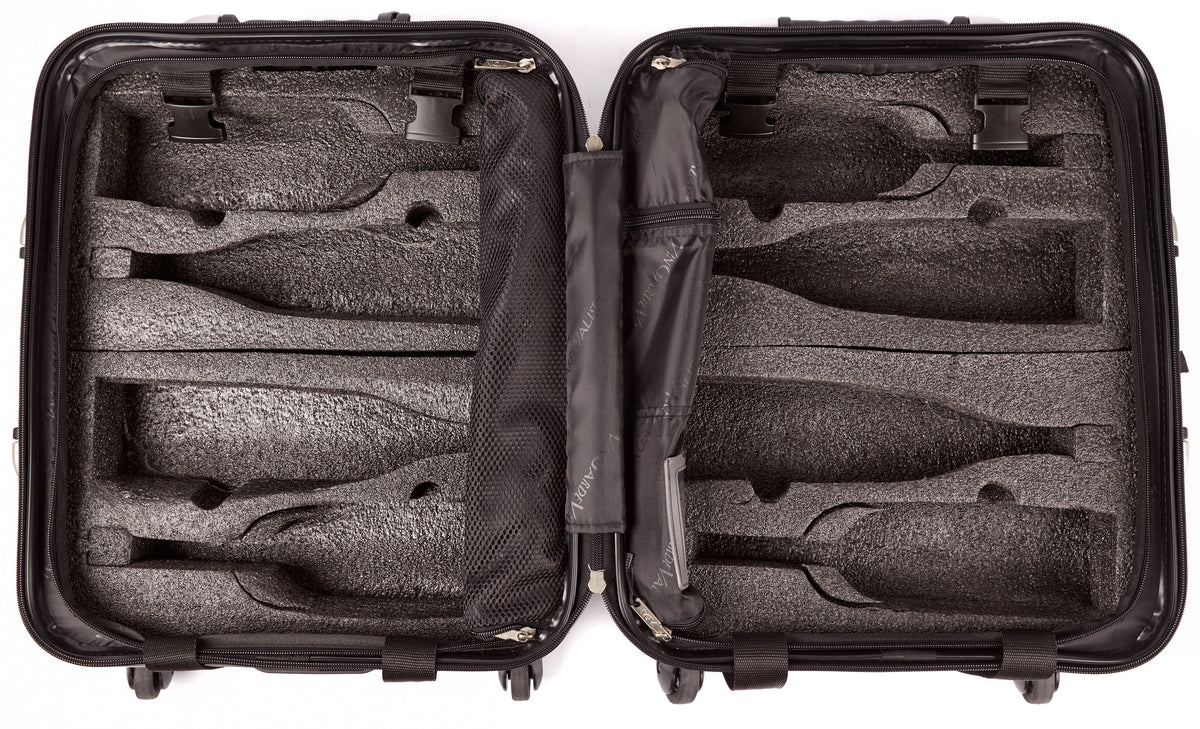 PETITE MODEL CAPACITY- Deep foam patented inserts included to accommodate up to 8 bottles (750 ml) of wine. (4) 2-bottle Inserts are removeable to travel with as many -or as few- bottles along with ample space for clothing and other travel items.