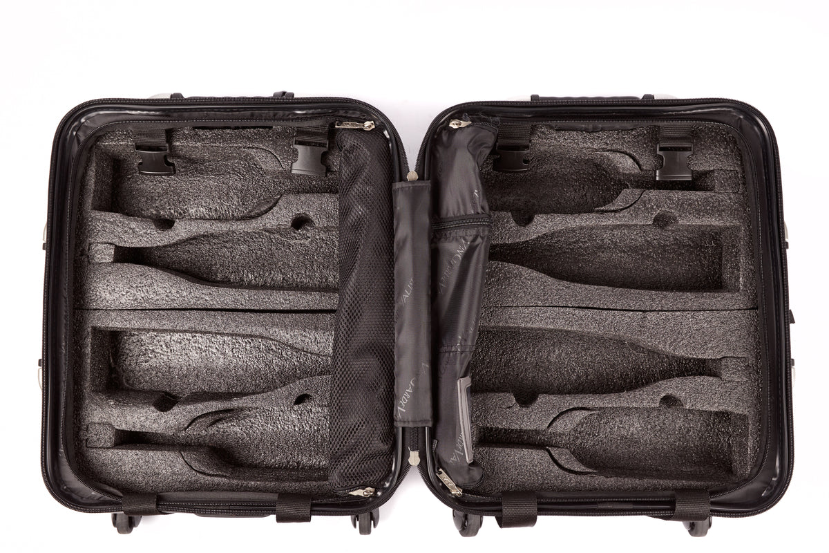 PETITE MODEL CAPACITY- Deep foam patented inserts included to accommodate up to 8 bottles (750 ml) of wine. (4) 2-bottle Inserts are removeable to travel with as many -or as few- bottles along with ample space for clothing and other travel items.