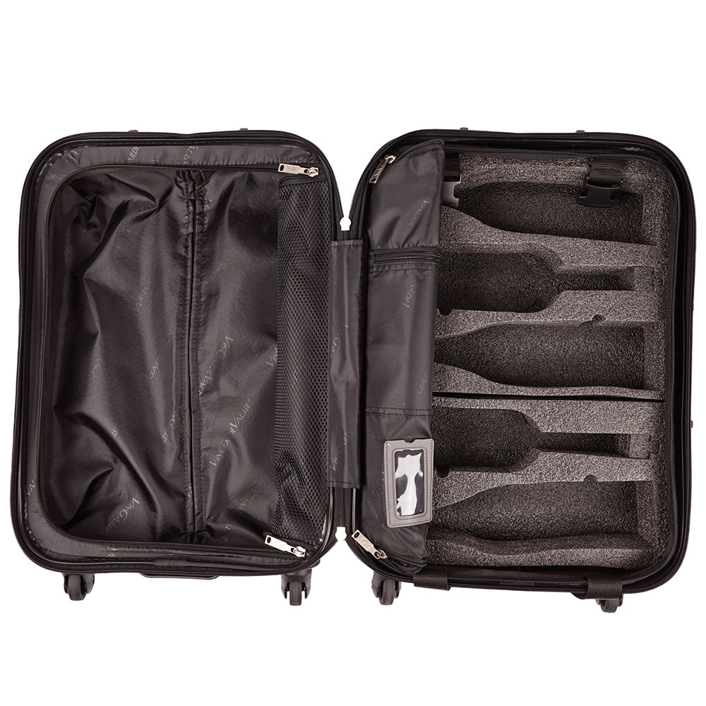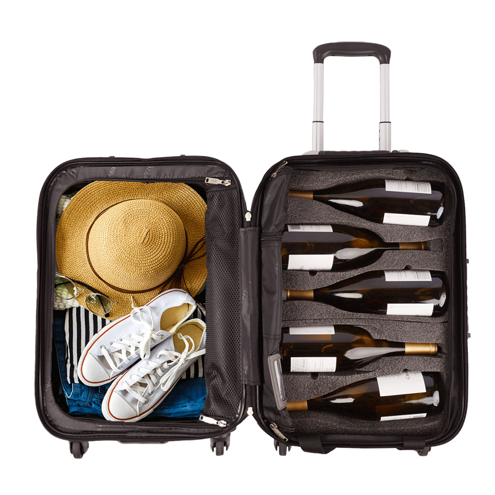 PICCOLO MODEL CAPACITY- Deep foam patented inserts included to accommodate up to 5 bottles (750 ml). 2 inserts are included to allow travel with 2, 3 or 5 bottles. When not traveling with wine, simply remove the inserts and the Piccolo transforms into an airline carry-on luggage and conveniently fits in the overhead (when not carrying liquids).