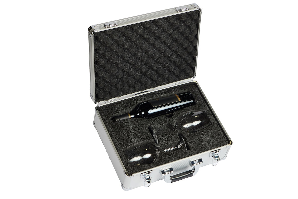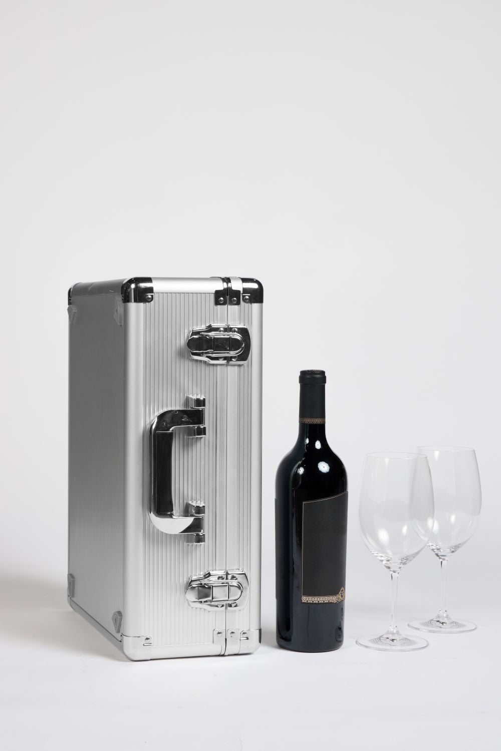 This aluminum frame personal carrying case accommodates one bottle and two wine glasses and is tailor made for wine or spirits lovers who like to have a stylish and durable way to take their special bottles and wine glasses with them to wherever they need to go.